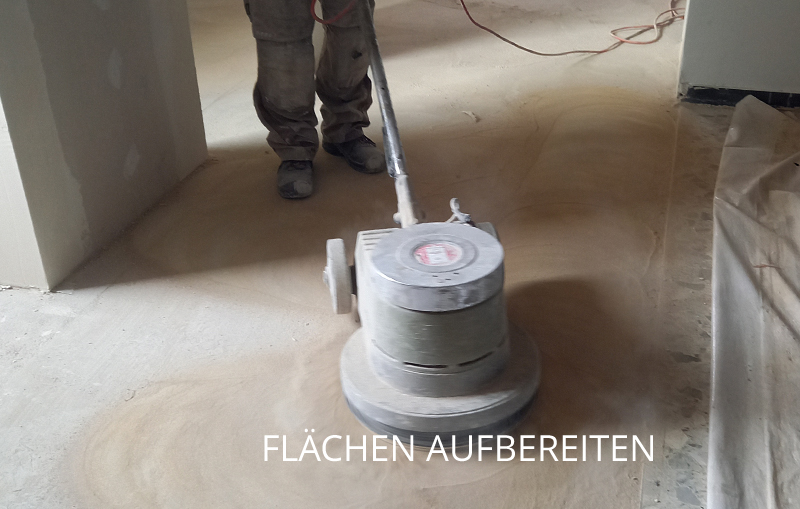Anschließend wird der Unterboden auf Schäden oder Unebenheiten geprüft und, falls nötig, saniert. Risse werden kraftschlüssig verbunden danach der Unterboden geschliffen und Unebenheiten mit Spachtelmasse ausgeglichen.