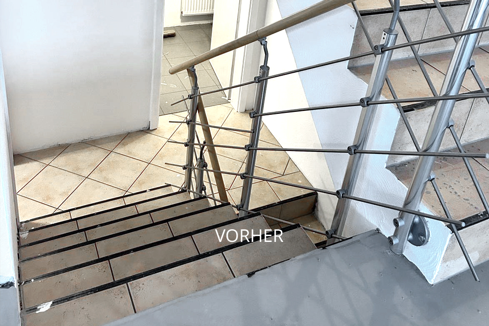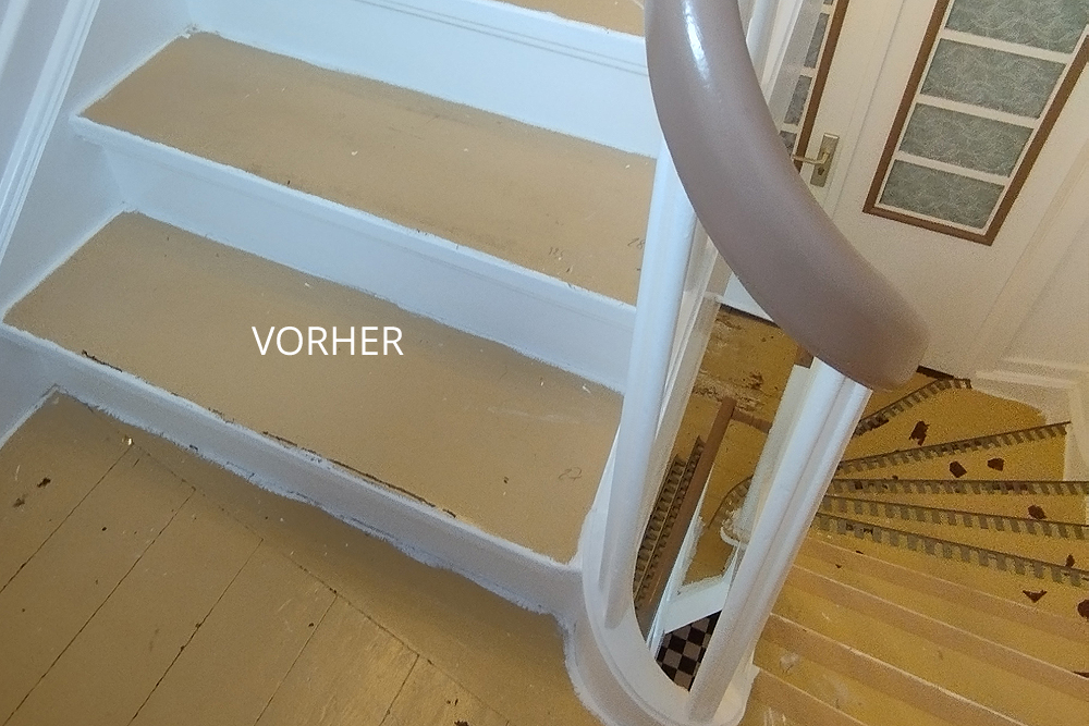 Die Stufen werden sorgfältig geschliffen, Klebereste entfernt und Unebenheiten gespachtelt, bevor wir eine neue Lackierung auftragen oder einen Oberboden verlegen.